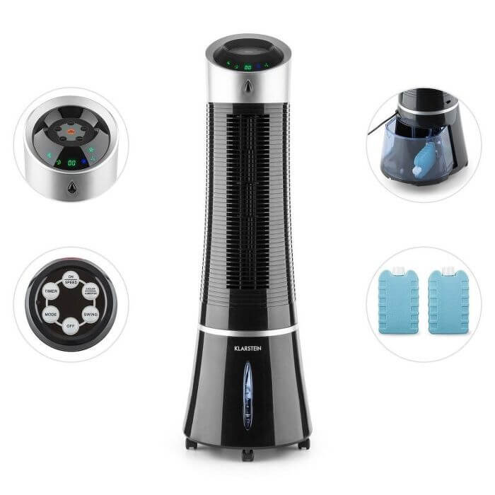 Zajímavou možností pro ochlazení vzduchu v interiéru je přístroj Klarstein Skyscraper Ice 4v1, který kombinuje funkce ventilátoru, chladiče, zvlhčovače vzduchu a čističky. Designově úsporná 28 cm vysoká věž se hodí do malých zákoutí a do interiéru dodává svěží vzduch ve třech rychlostech. O chlazení a zvlhčování vzduchu se stará šestilitrová nádrž na vodu. Ovládání věže je jednoduché a intuitivní pomocí panelu na přístroji nebo prostřednictvím dálkového ovládání. Vzhledem k vysokému průtoku vzduchu se hodí i do větších místností.