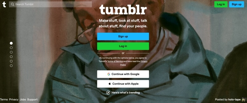Další síť pro tvorbu vlastního blogu. Její uživatelé ji využívají k tvorbě vlastních stránek, portfolií, k prezentaci své práce (psaní, kreslení, focení a další) nebo k hromadění příspěvků na určité téma (např. oblíbený film, kapela, knížka apod.). Kromě profesních profilů tu tak vznikají zajímavé fanouškovské základny a komunity. Profily a blogy jiných uživatelů můžete skrze svůj profil sledovat a také na svém blogu sdílet příspěvky z jiných profilů, které vás zaujmou. Tumblr podporuje sdílení obrázků, textu, fotografií, odkazů, ale i citátů, hudby, videí nebo dokonce gifů a mnoho dalšího. Velmi známou alternativou k této sociální síti je například rozšířený Blogger nebo Typepad.